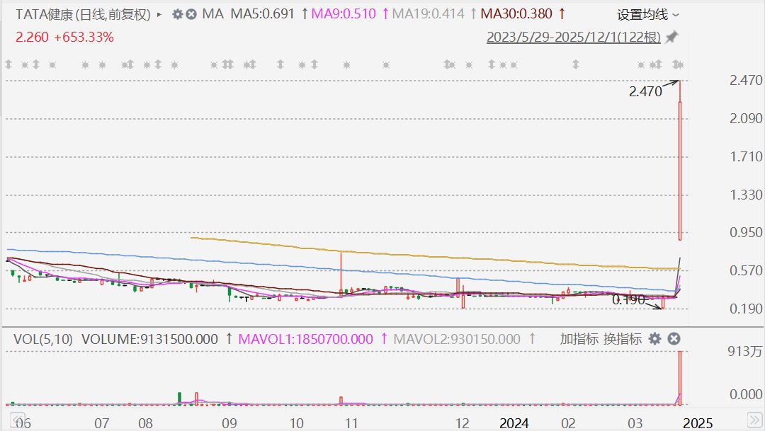 格隆汇12月1日|TATA健康(1255.HK)时隔逾1年半复牌大涨,午后涨幅一度扩大至723.33%,报2.47港元,截至目前成交逾1700万港元。该公司主营位于香港的鞋类零售,已达成所有复牌指引,包括刊发未刊发财务业绩、证明业务持续可行、进行独立内部控制审查等。