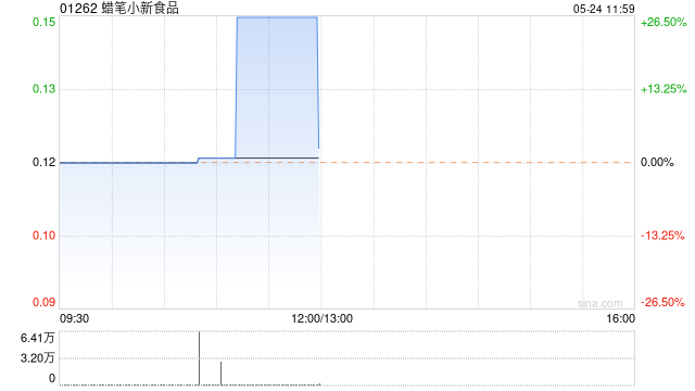 蜡笔小新食品(01262.hk)股票出现异动,股价大幅上涨26.50%,现报0.148港元,成交额1.10万港元,港股市值1.97亿港元。