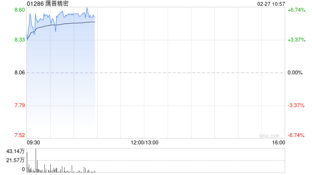 鹰普精密(01286)盘中涨超6%,高见8.60港元,创上市新高,年初至今股价累计涨超70%。截至发稿,股价上涨5.96%,报8.54港元,成交额3465.20万港元。