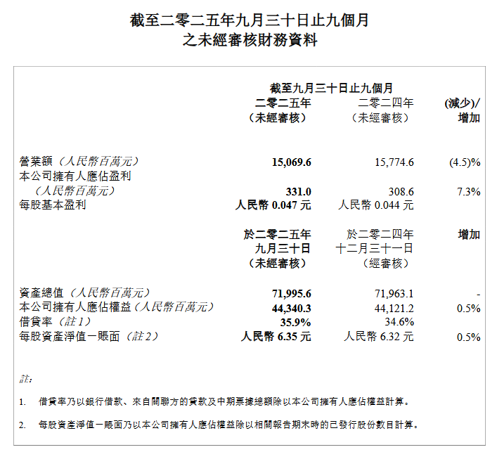 10月24日,华润建材科技发布公告称,2025年前三季度营业额约150.696亿元,同比降4.5%;公司拥有人应占净利润3.31亿元,同比增长7.3%。主要由于期间内集团水泥产品销售成本同比下降所致。