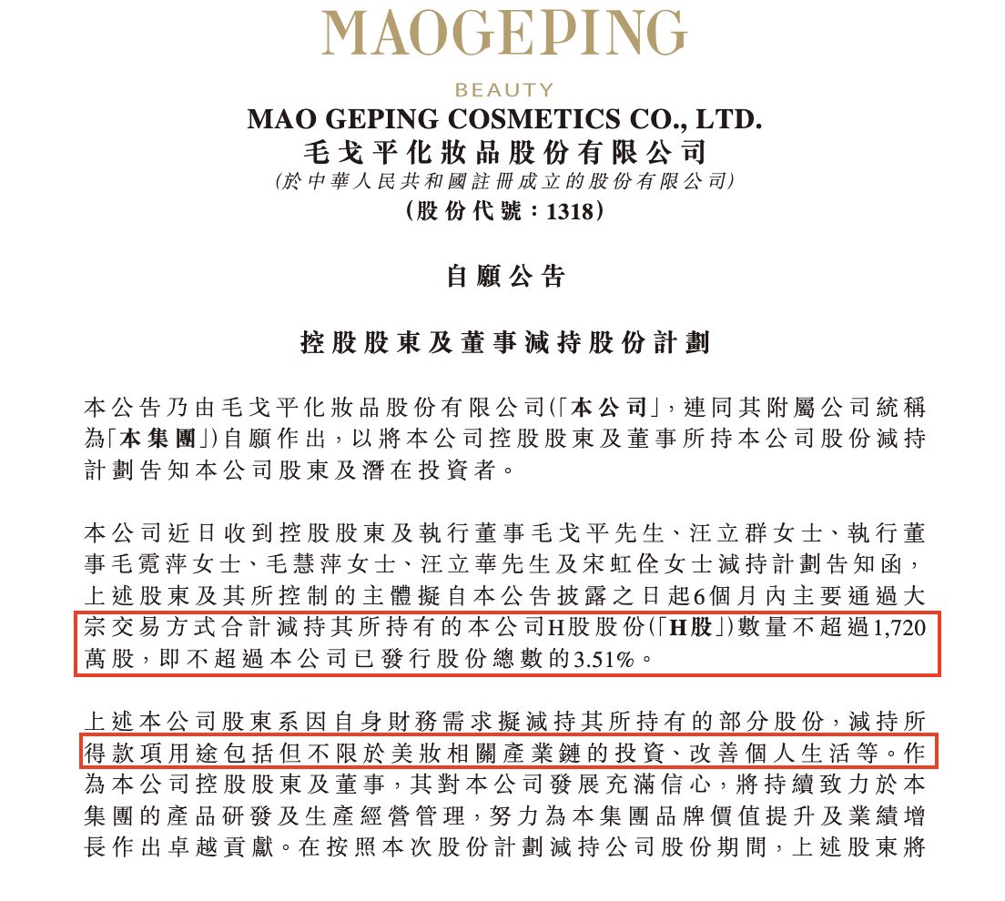 近日,登陆港股市场刚满一年的毛戈平化妆品股份有限公司发布了一则引发市场关注的公告:公司控股股东毛戈平、其配偶汪立群,以及毛戈平的两位姐姐毛霓萍、毛慧萍,汪立群的弟弟汪立华,加上核心高管宋虹佺,共计6人计划在未来6个月内减持不超过1720万股H股,占公司已发行股份总数的3.51%。