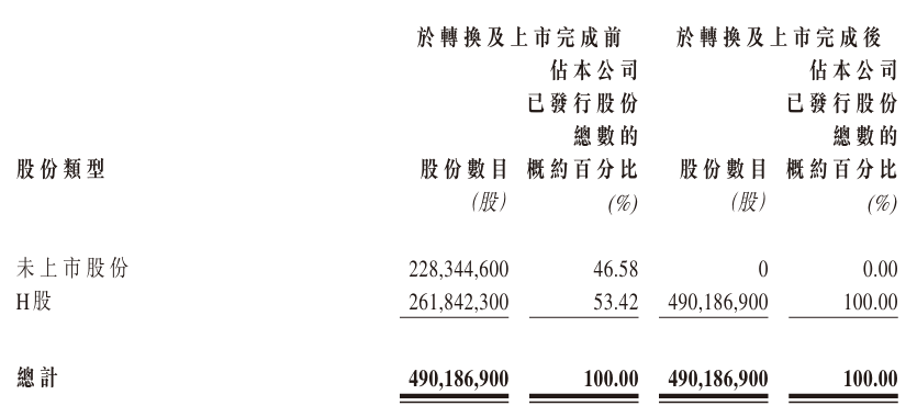 在转换及上市完成前后,本公司的股权架构列示如下: