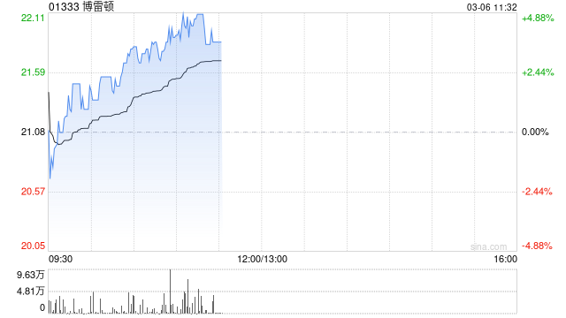 博雷顿(01333)盘中涨近5%,截至发稿,股价上涨3.70%,现报21.86港元,成交额3295.49万港元。