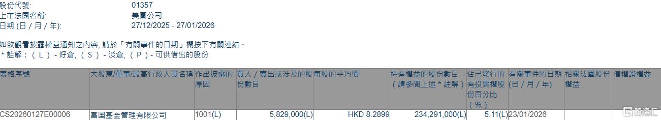 格隆汇1月27日丨根据联交所最新权益披露资料显示,2026年1月23日,美图公司(01357.HK)获富国基金管理有限公司在场内以每股均价8.2899港元增持582.9万股,涉资约4832.2万港元。