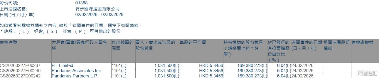 格隆汇3月2日丨根据联交所最新权益披露资料显示,2026年2月24日,特步国际(01368.HK)获FIL Limited在场内以每股均价5.3456港元增持103.15万股,涉资约551.4万港元。