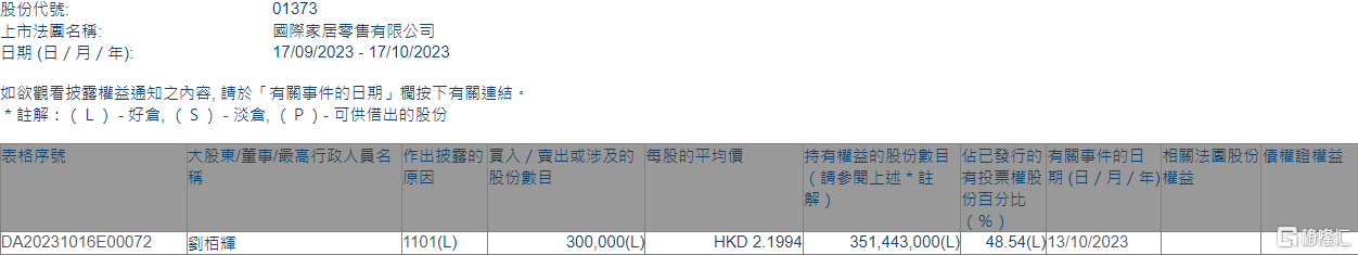 格隆汇10月17日丨根据联交所最新权益披露资料显示,2023年10月13日,国际家居零售(01373.HK)获执行董事刘栢辉在场内以每股均价2.1994港元增持30万股,涉资约65.98万港元。