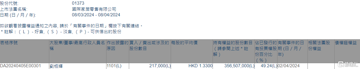 格隆汇4月8日丨根据联交所最新权益披露资料显示,2024年4月2日,国际家居零售(01373.HK)获执行董事刘栢辉在场内以每股均价1.33港元增持21.7万股,涉资约28.86万港元。