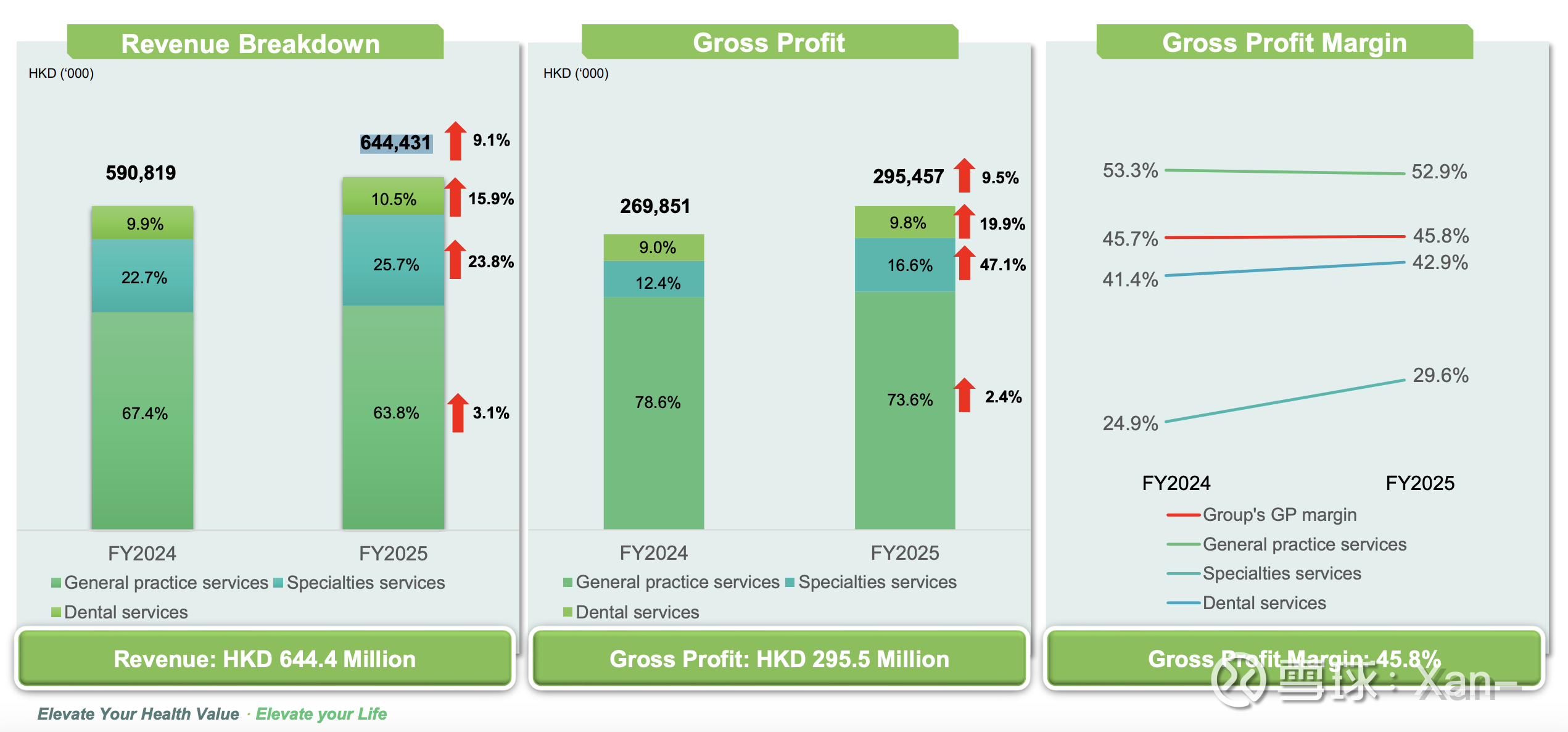 全年收益增6.4亿港元,较2024财年增长约9.1%。全科医疗、专科医疗及牙科服务收入的全涨了。