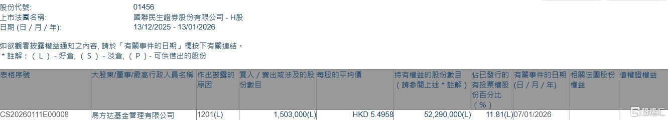 格隆汇1月13日丨根据联交所最新权益披露资料显示,2026年1月7日,国联民生(01456.HK)遭易方达基金管理有限公司在场内以每股均价5.4958港元减持150.3万股,涉资约826.02万港元。