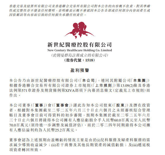 近日,新世纪医疗(01518.HK )发布盈利预警公告,预期集团于截至2025年6月30日止六个月将取得公司拥有人应占亏损介于人民币6000万元至7000万元,较2024年同期2520万元的净利润断崖式下滑近亿元。