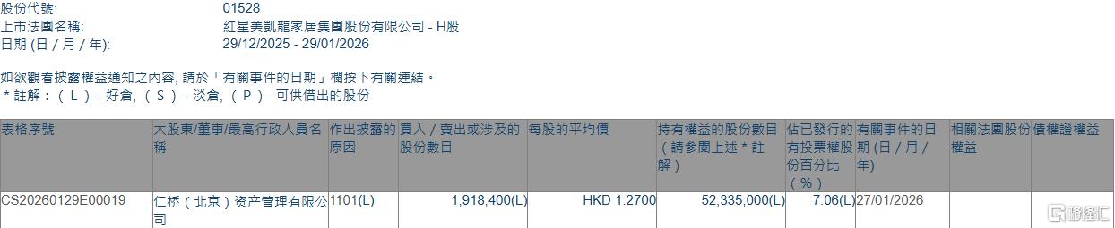 格隆汇1月29日丨根据联交所最新权益披露资料显示,2026年1月27日,红星美凯龙(01528.HK)获仁桥(北京)资产管理有限公司在场内以每股均价1.27港元增持191.84万股,涉资约243.64万港元。