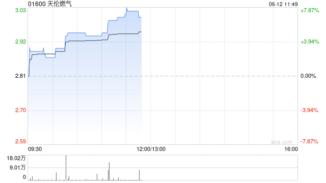 天伦燃气(01600)午前涨幅一度扩大逾7%,4月中旬至今累计涨幅已超30%。截至发稿,股价上涨6.76%,现报3港元,成交额221.01万港元。