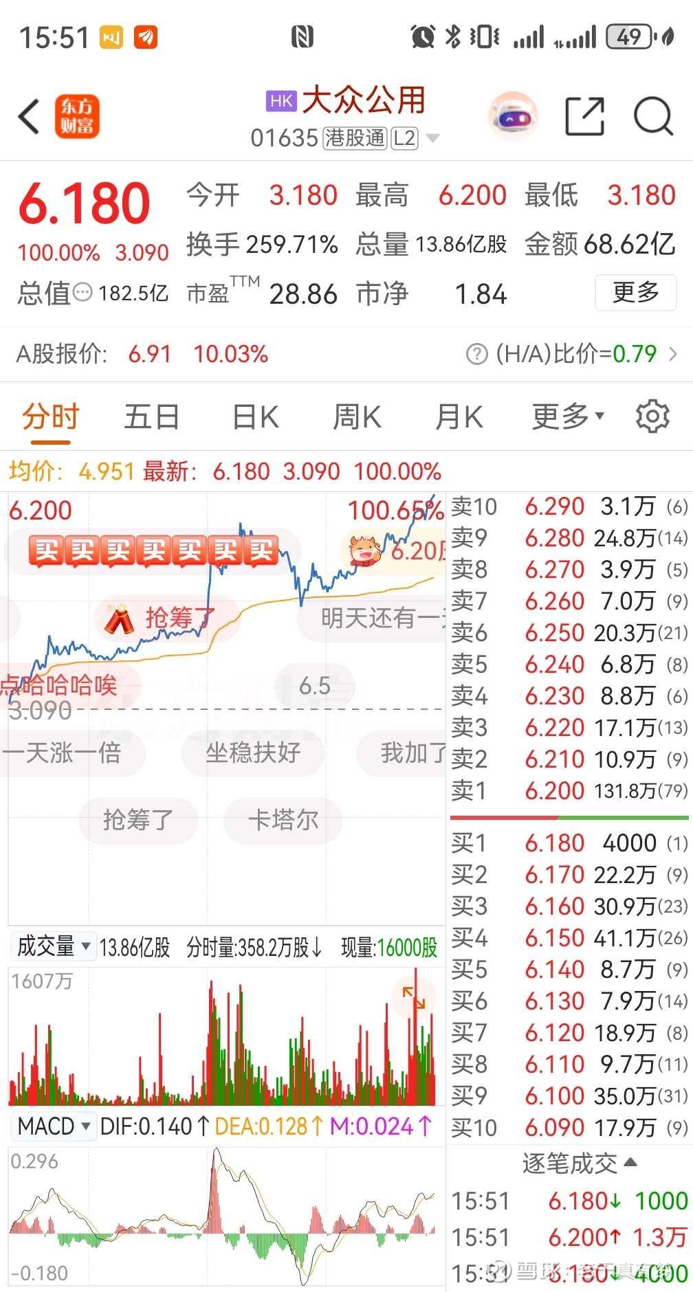 今天还能买到跌的票,比如我的大众公用