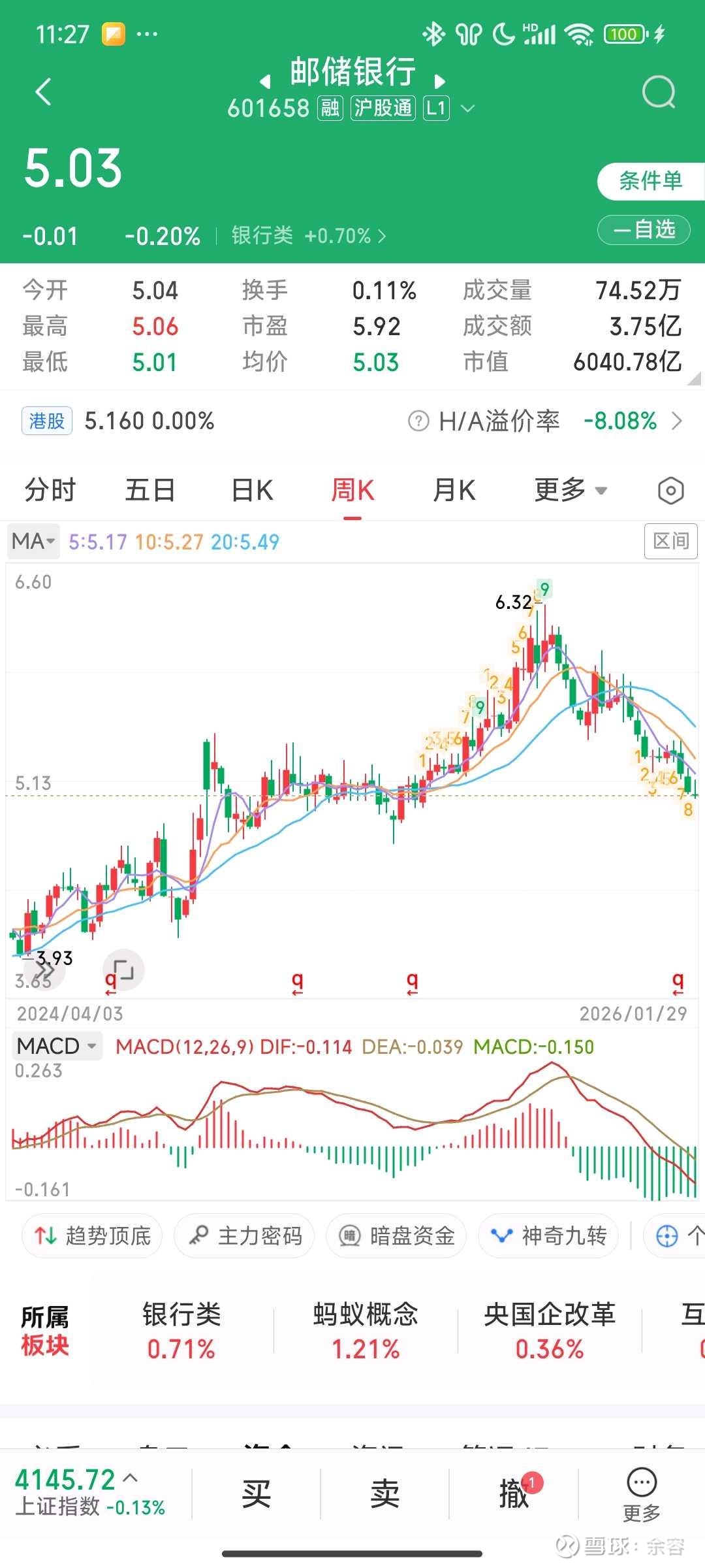 :这是邮储银行的周线,已开始买入