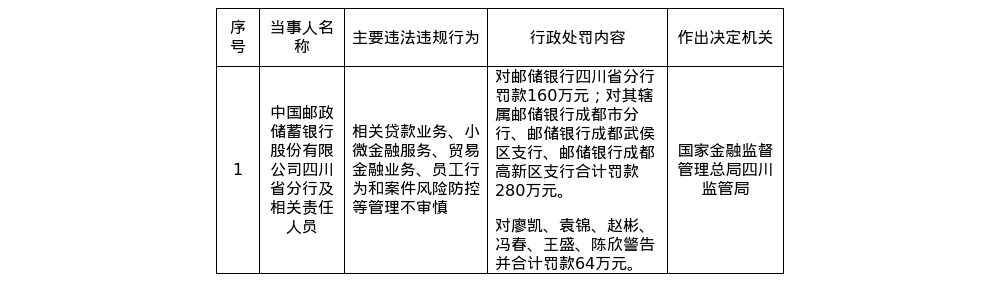 罚单显示,中国邮政储蓄银行股份有限公司四川省分行的主要违法违规事实(案由)为:相关贷款业务、小微金融服务、贸易金融业务、员工行为和案件风险防控等管理不审慎。
