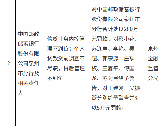 针对上述违法违规行为,泉州金融监管分局对邮储银行泉州市分行合计处以280万元罚款,对蔡小花、苏连声、李艳、吴超、郭宗源、庄耿权、王嘉平、傅国龙、苏为民给予警告,对王建刚、吴振跃分别给予警告并处以5万元罚款。