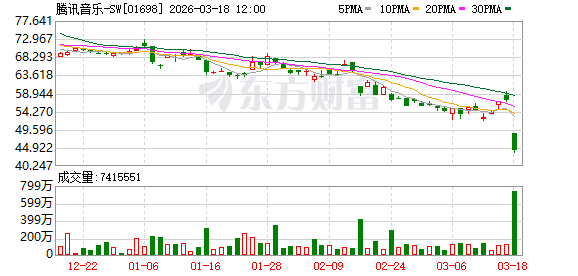 3月18日,腾讯音乐-SW(HK1698)港股开盘跌超20%,截至发稿股价下跌22.87%,报44.12港元/股,总市值1366.13亿港元。