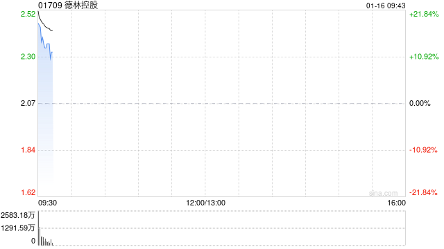 德林控股(01709)早盘高开近15%,截至发稿,股价上涨14.01%,报2.36港元,成交额1.63亿港元。
