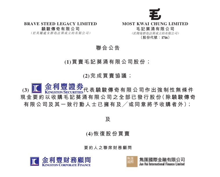 马黎阳表明不会加价,并有意维持毛记葵涌之上市地位。倘所有股东接纳要约,马黎阳须额外多付6580万港元。马黎阳已透过自有资金支付今次收购代价中的8000万港元,余下4220万港元以贷款融资支付。