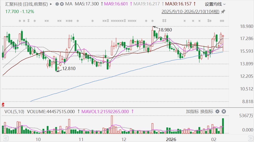 格隆汇2月10日|汇聚科技(1729.HK)盘初一度跌超12%至15.64港元,目前跌幅收窄至1%左右,成交额放大至7.3亿港元。
