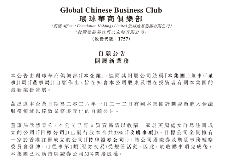 环球华商俱乐部(01757.HK)于周四(3月19日)发布公告,公司已订立买卖协议以收购一家香港持牌证券公司33%间接股权,后者获证监会发牌,可从事第1类(证券交易)受规管活动。