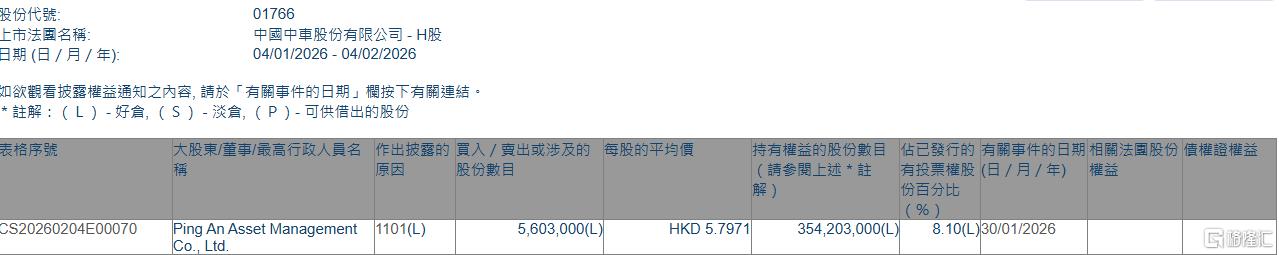 格隆汇2月4日丨根据联交所最新权益披露资料显示,2026年1月30日,中国中车(01766.HK)获Ping An Asset Management Co., Ltd.在场内以每股均价5.7971港元增持560.3万股,涉资约3248.12万港元。