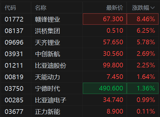 格隆汇1月15日|港股锂电池股继续拉升上涨,其中,赣锋锂业涨超8%领衔,洪桥集团涨6.25%,天齐锂业涨近6%,中创新航涨近3%实现6连升,宁德时代、天能动力、比亚迪股份、正力新能均有涨幅。