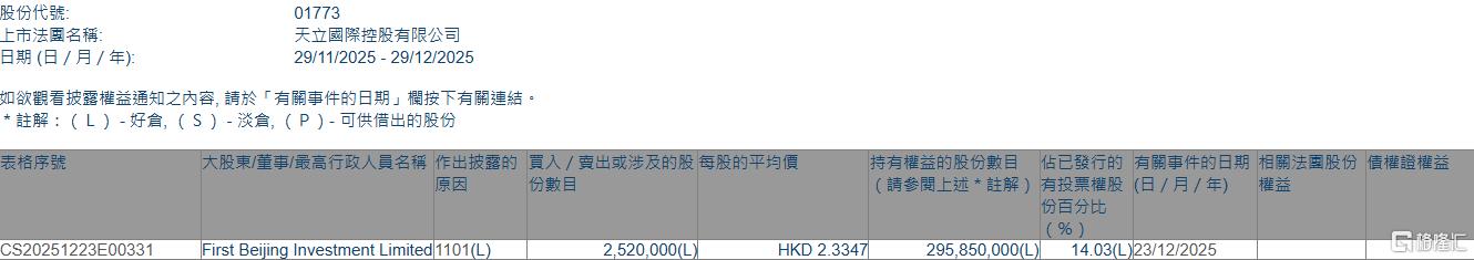 格隆汇12月29日丨根据联交所最新权益披露资料显示,2025年12月23日,天立国际控股(01773.HK)获First Beijing Investment Limited在场内以每股均价2.3347港元增持252万股,涉资约588.34万港元。