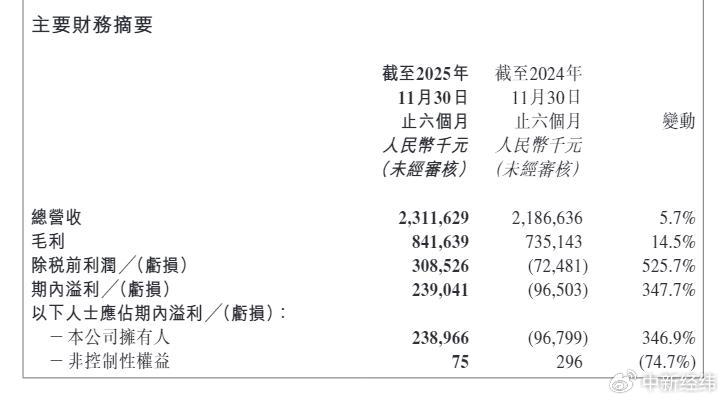 28日,东方甄选披露《截至2025年11月30日止六个月的中期业绩公告》称,于2026财年上半年,实现总营收23.12亿元,同比增长5.7%;公司拥有人应占期内溢利2.39亿元,2025财年同期为亏损9679.9万元,同比增长346.9%。