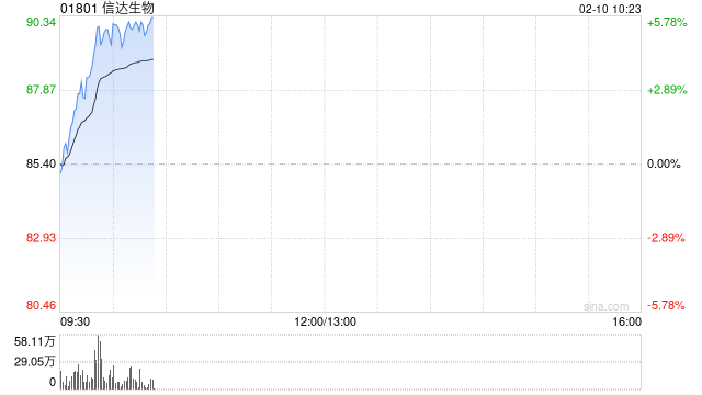 信达生物(01801)早盘股价上涨5.15%,报89.80港元,成交额6.86亿港元。