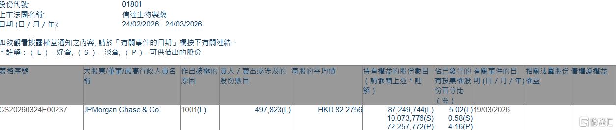 格隆汇3月24日丨根据联交所最新权益披露资料显示,2026年3月19日,信达生物(01801.HK)获JPMorgan Chase & Co.以每股均价82.2756港元增持好仓49.78万股,涉资约4095.87万港元。