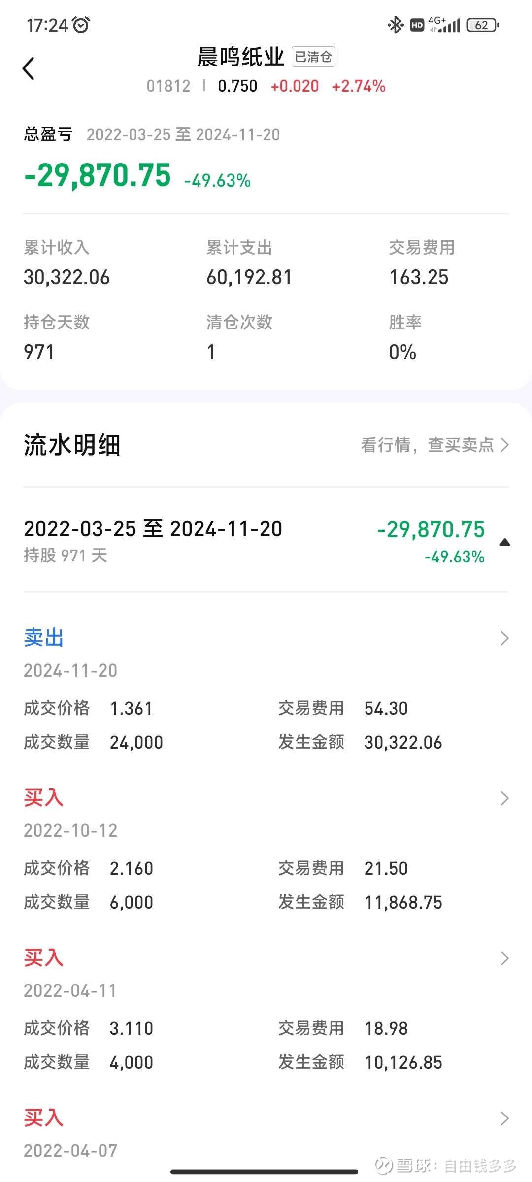 : 虽然亏损一半跑路的,不过卖出时还是很果决,开盘前下浮20%挂单,成功卖出。现在港股晨鸣纸业还有0.75元,相对我的卖出价又腰斩了,A股已经st了!这就是当年的纸茅