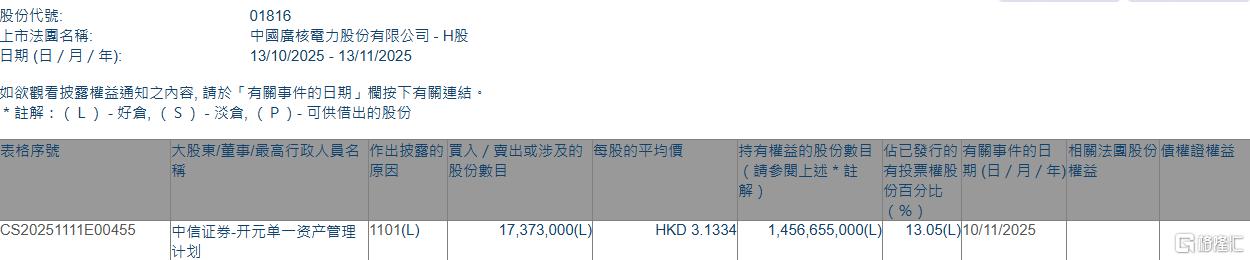 格隆汇11月13日丨根据联交所最新权益披露资料显示,2025年11月10日,中广核电力(01816.HK)获中信证券-开元单一资产管理计划在场内以每股均价3.1334港元增持1737.3万股,涉资约5443.66万港元。