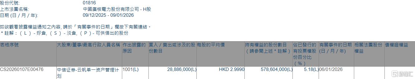 格隆汇1月9日丨根据联交所最新权益披露资料显示,2026年1月6日,中广核电力(01816.HK)获中信证券-云帆单一资产管理计划在场内以每股均价2.999港元增持2888.6万股,涉资约8662.9万港元。