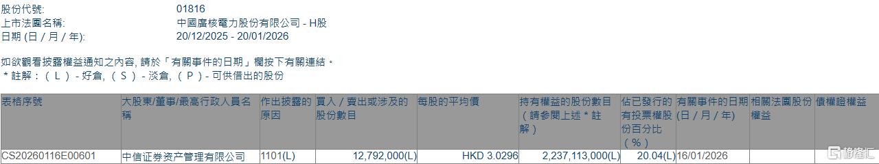 格隆汇1月20日丨根据联交所最新权益披露资料显示,2026年1月16日,中广核电力(01816.HK)获中信证券资产管理有限公司在场内以每股均价3.0296港元增持1279.2万股,涉资约3875.5万港元。