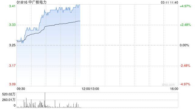 中广核电力(01816)早盘涨超4%,截至发稿,股价上涨4.62%,现报3.40港元,成交额2.01亿港元。