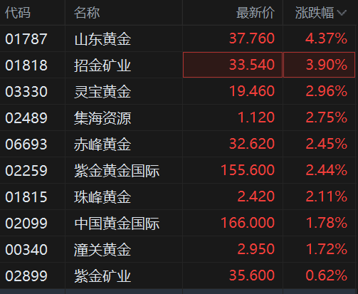 港股黄金股继续上涨行情,其中,山东黄金涨超4%,招金矿业涨3.9%,灵宝黄金涨3%,赤峰黄金、紫金黄金国际、珠峰黄金涨超2%,中国黄金国际、潼关黄金涨1.7%。