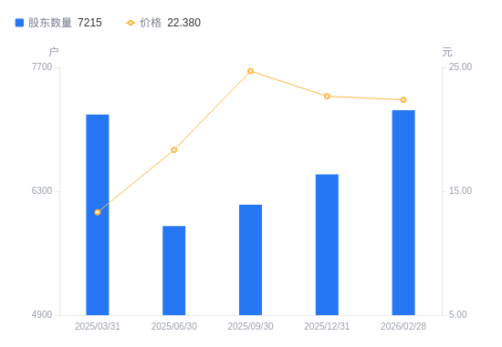 近一年(2025年2月28日至2026年2月28日),春立医疗A股股东户数从6666户,增加至7215户,增幅8.24%,区间股价上涨66.74%。