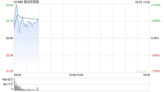 建滔积层板(01888)盘中涨超6%,截至发稿,股价上涨2.62%,现报23.50港元,成交额3.86亿港元。