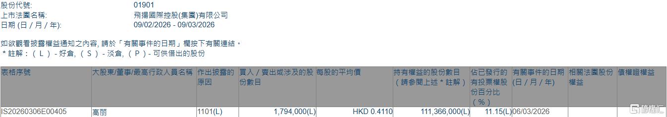 格隆汇3月9日丨根据联交所最新权益披露资料显示,2026年3月6日,飞扬集团(01901.HK)获股东高丽在场内以每股均价0.411港元增持179.4万股,涉资约73.73万港元。