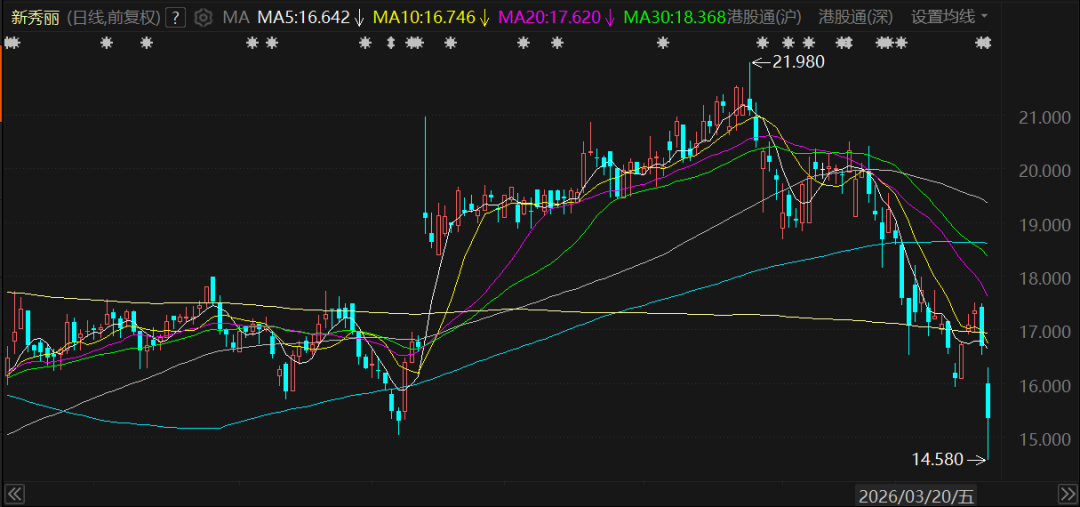 3月20日盘中,新秀丽下跌约8%,保持在15港元/股以上。