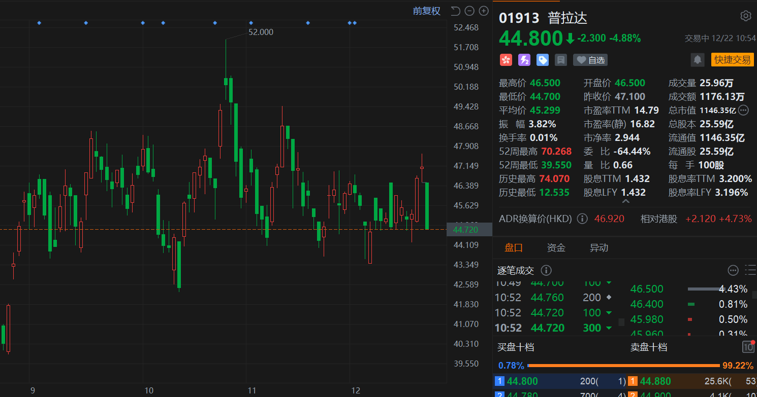普拉达(1913.HK)开盘持续走低,盘中跌超5%,现报44.8港元,总市值1146亿港元。消息上,摩根士丹利(Morgan Stanley)的分析师在一份报告中称,在奢侈品时尚界新一轮创意浪潮之际, 普拉达 (Prada)将难以维持其增长势头。大摩摩根士丹利称,随着其Miu Miu品牌发展步伐放缓,该意大利时尚集团可能会是今年最后一个季度录得增长放缓的少数几家奢侈品公司之一。该行将普拉达在香港上市股票的目标价从53港元下调至51港元,维持与大市同步评级。
