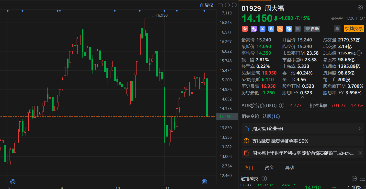 周大福(01929.HK)大幅下跌超7%,报14.15港元,总市值1395.9亿港元。消息上,周大福昨日公布2026财政年度中期业绩(2025年4月1日至9月30日)。上半年营收389.9亿港元,预估401.9亿港元;上半年净利润25.3亿港元,预估26.3亿港元;上半年每股中期派息0.22港元。报告期内,集团营业额有所下滑,股东应占溢利微增0.1%。