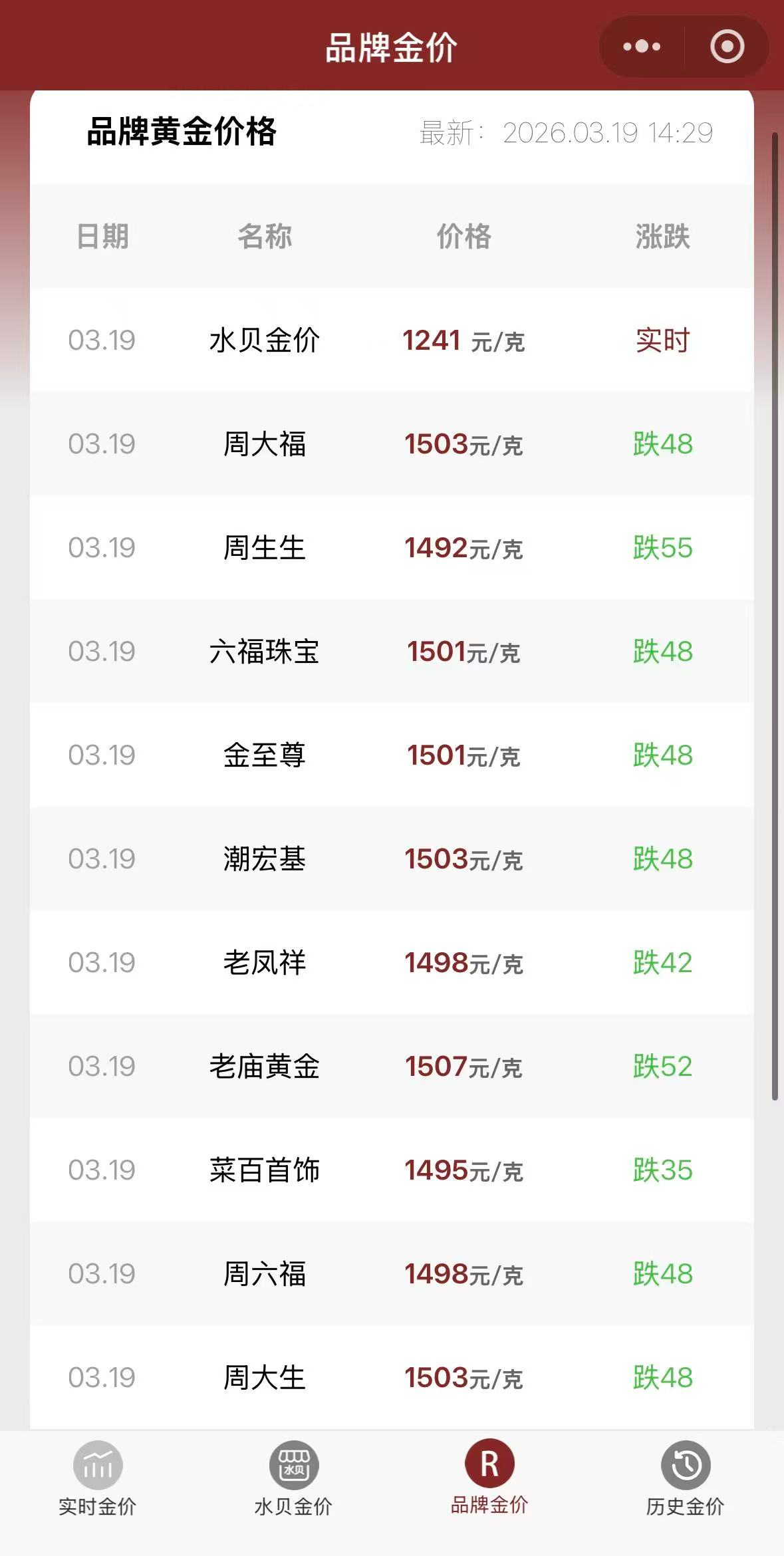 3月19日,国内多品牌金饰价格连跌多日。今日金价小程序显示,截至发稿,国内多个黄金品牌的足金报价已较月内最高点下跌超130元。其中,周大福(01929.HK)金饰克价1503元,较前一日1551元/克的价格下跌48元/克;周生生(00116.HK)金饰克价1492元,较前一日1547元/克的价格下跌55元/克,相比3月3日的月内高点1650元/克跌158元;老庙黄金金饰克价1507元,较前一日下跌52元/克;此外,六福珠宝、周六福(06168.HK)、潮宏基(002345.SZ)等多个品牌金饰克价均较前一日下跌48元。