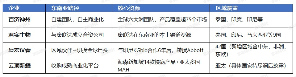 放眼望去,已在东南亚落子的中国药企不在少数,但路径选择各异。我们选取三家最具代表性的企业——百济神州、君实生物、复宏汉霖,与云顶新耀的方案进行对比: