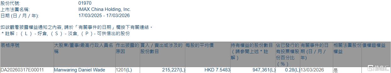 格隆汇3月17日丨根据联交所最新权益披露资料显示,2026年3月13日,IMAX CHINA(01970.HK)遭Manwaring Daniel Wade在场内以每股均价7.5483港元减持21.52万股,涉资约162.5万港元。