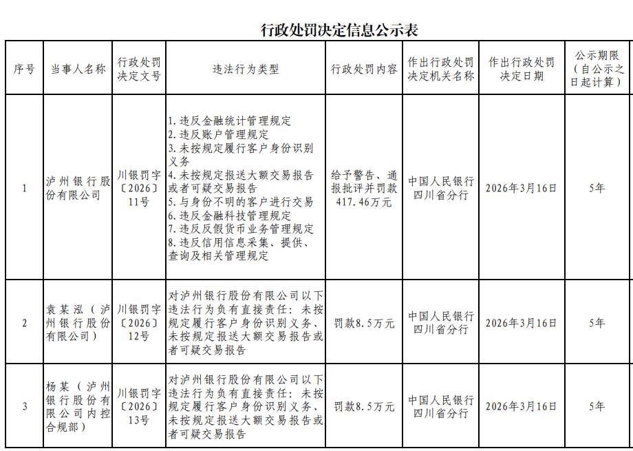 其中,袁某泓(泸州银行股份有限公司)因对未按规定履行客户身份识别义务、未按规定报送大额交易报告或者可疑交易报告的违法行为负有直接责任,被罚款8.5万元。