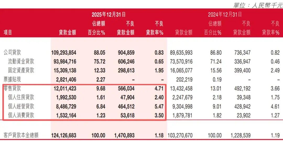 从零售贷款具体分类来看,2025年,该行个人经营贷款、个人住房贷款、个人消费贷款余额均出现下降,分别同比下滑8.79%、11.35%、18.47%。