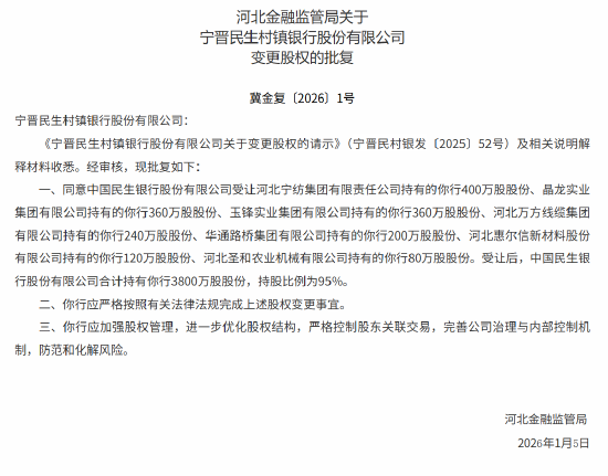 1月9日金融一线消息,河北金融监管局发布批复,同意民生银行受让河北宁纺集团有限责任公司持有的宁晋民生村镇银行400万股股份、晶龙实业集团有限公司持有的宁晋民生村镇银行360万股股份、玉锋实业集团有限公司持有的宁晋民生村镇银行360万股股份、河北万方线缆集团有限公司持有的宁晋民生村镇银行240万股股份、华通路桥集团有限公司持有的宁晋民生村镇银行200万股股份、河北惠尔信新材料股份有限公司持有的宁晋民生村镇银行120万股股份、河北圣和农业机械有限公司持有的宁晋民生村镇银行80万股股份。受让后,民生银行合计持有宁晋民生村镇银行3800万股股份,持股比例为95%。