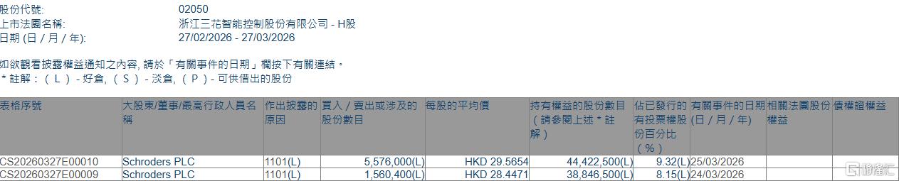 格隆汇3月27日丨根据联交所最新权益披露资料显示,2026年3月24日-3月25日,三花智控(02050.HK)获Schroders PLC在场内以每股均价28.4471港元及29.5654港元合计增持713.64万股,涉资约2.09亿港元。